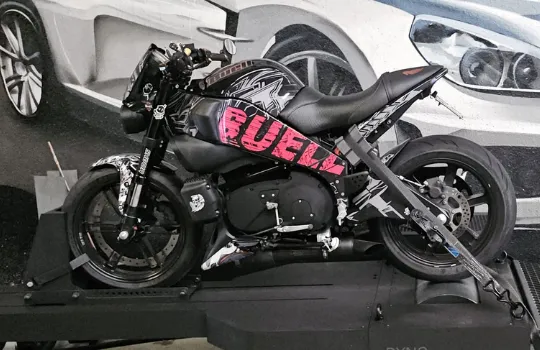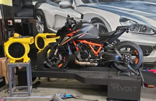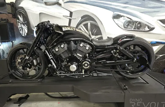We plaatsen je motor op de dyno (testbank). Dit is een speciale machine die exact vermogen, koppel en lucht/brandstofverhouding meet. Zo weten we hoe je motor écht draait.
